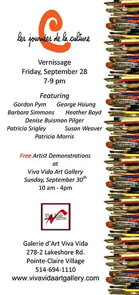 Viva Vida Art Gallery is joining in on the fun with a special vernissage on Friday September 28th from 7-9 pm and free artist demonstrations on the following Sunday, September 30th from 10am-4pm (see program below). | Pictures >>