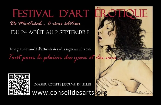Under the honorary chairmanship of Mr. Andy Nulman, President of Just For Laughs Festival, the Festival's success is easy to understand. Although the programming is far from complete, here are some players in the program this year: the Council of Quebec artists present an exhibition of more then 50 artists with a variety of activities. Erotic Signature arrives from Miami. Fetish Weekend recurrence at the Olympia and the beautiful World of Daring Erotic Ball will take place. Not to mention James Scarlett, the burlesque queen who will also present with this performing art. And newcomers to the underground art, such as DÉCOVER Magazine and VIP Virus Pictorial Improvisation or the Bronze Museum of Inverness with its exhibition titled "Eros". The festival will run from August 24 - September 2 with a vernissage on August 30 from 17h - 24h.